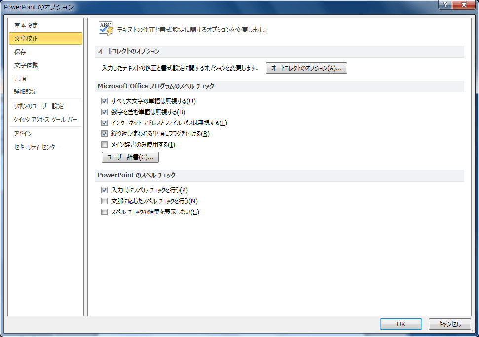 PowerPointに限らず、Microsoft Office のすべてのアプリケーションに適用されるスペルチェックの設定オプションは以下の通りです。