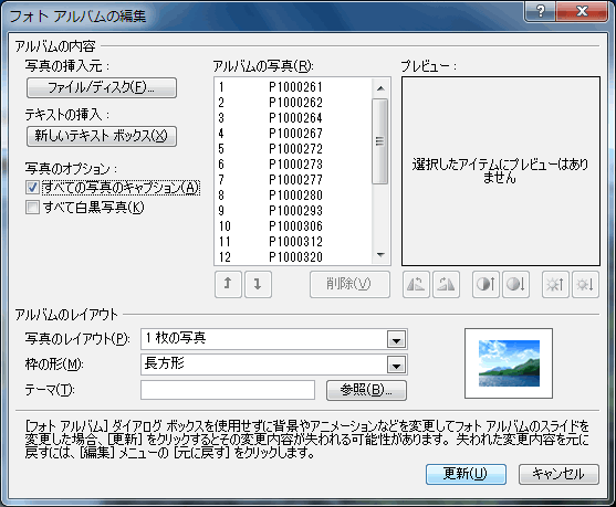 [フォトアルバムの編集]ダイアログボックスの[写真のレイアウト]が[スライドに合わせる]に設定されている場合[写真のオプション]の[すべての写真のキャプション]のチェックボックスが利用できません。それ以外を選択します。ここでは[1枚の写真]を選択します。