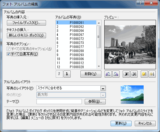 - [フォトアルバムの編集]ダイアログボックスが表示されたら、[すべて白黒写真]にチェックを付けて[更新]ボタンをクリックします。