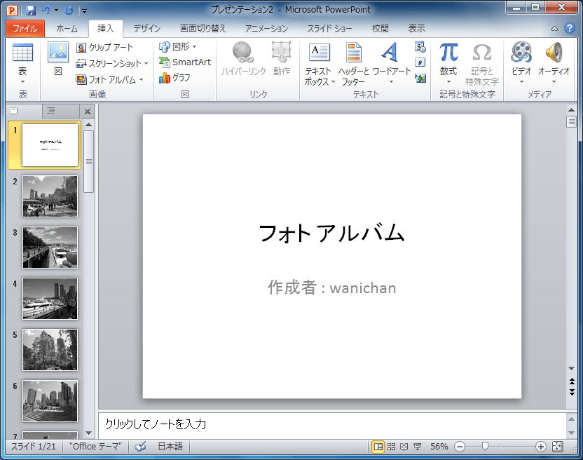- [挿入]タブの[画像]グループの[フォトアルバム]の▼をクリックします。