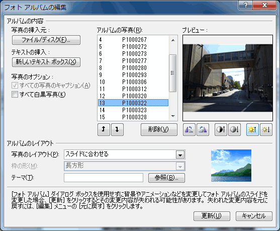 - [フォトアルバムの編集]ダイアログボックスの[アルバムの写真]一覧から写真を選択して、明るさ調整ボタンをクリックします。