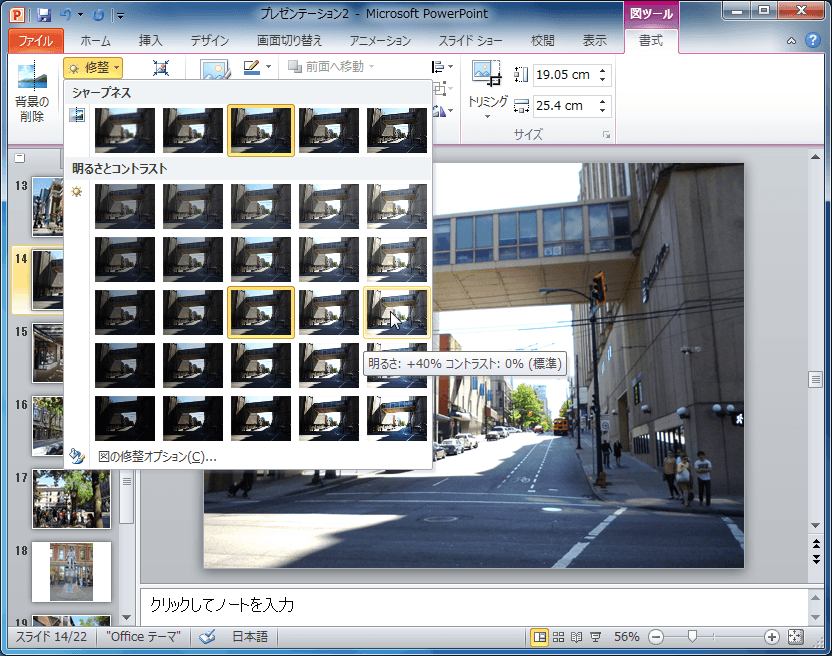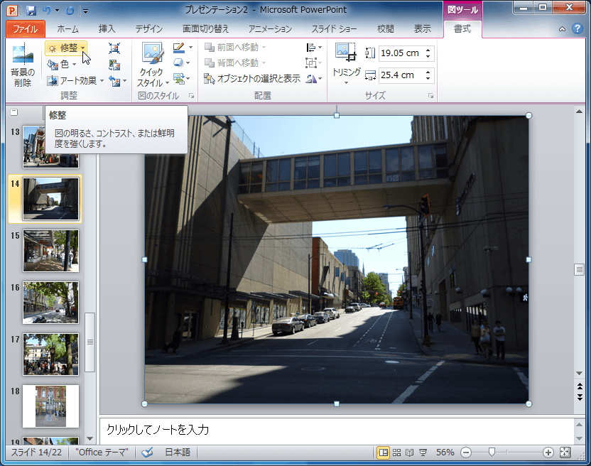 - スライドに挿入された画像を選択し、[図ツール]の[書式]タブを開きます。