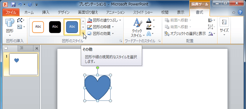 - [図形のスタイル]グループのスタイル一覧右下の[その他]をクリックします。