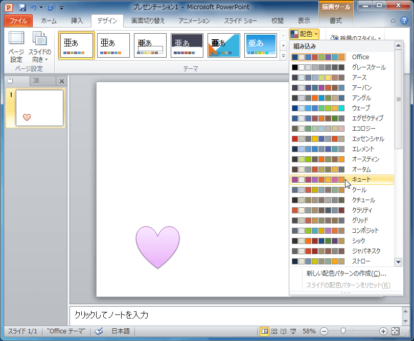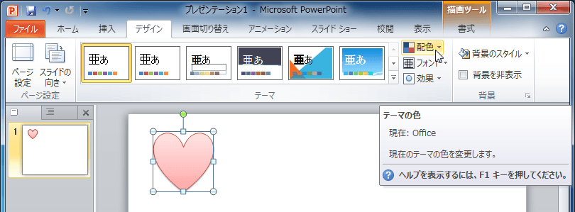 - [デザイン]タブを開き、[配色]をクリックします。