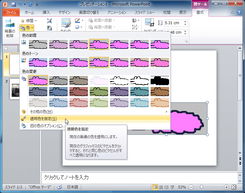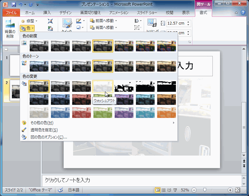 PowerPoint 2010で品質向上のために、またはプレゼンの内容に合わせて色の彩度やトーン(色の温度)、画像の色をグレースケール・セピア・ウォッシュアウト・白黒等に変更できます。[図ツール]の[書式]タブを開き、[色]をクリックして、一覧から画像の色を選択します。なお、256色以下の図の透明色を指定することも可能です。