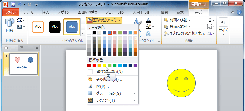 PowerPoint 2010で図形の塗りつぶしスタイルを変更するには、対象となる図形を選択し、[描画ツール]の[書式]タブを開いて、[図形のスタイル]グループの[図形の塗りつぶし]をクリックし、一覧から色を選択します。[ホーム]タブにも[図形の塗りつぶし]コマンドボタンがあります。