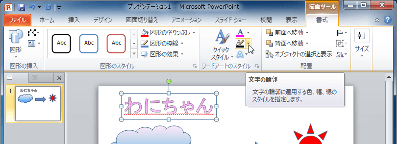 PowerPoint 2010で[描画ツール]の[書式]タブを開き、[ワードアートのスタイル]グループの[文字の輪郭]の▼をクリックして、文字の輪郭の色や線の種類などを選択します。