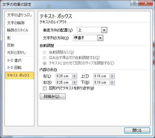 [ワードアートのスタイル]グループ右下のダイアログボックス起動ツールをクリックすると、[文字の効果の設定]ダイアログボックスが表示されるので、それぞれ詳細設定が行えます。
