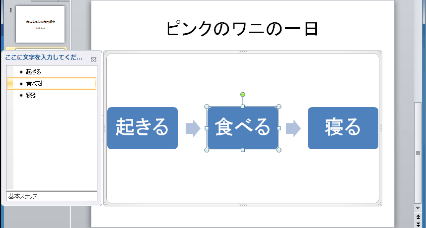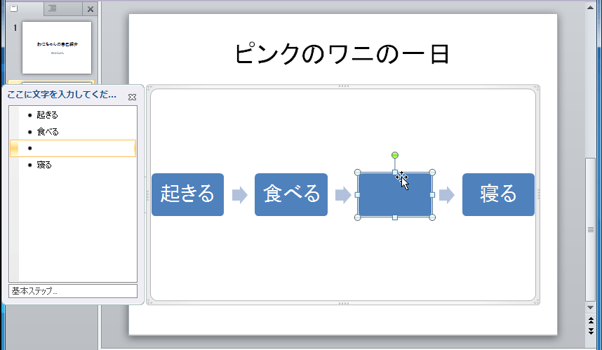 PowerPoint 2010でSmartArtグラフィックに図形を追加するには、テキストウィンドウのアウトラインで項目を追加します。不要な図形を削除するには、スライドペインの対象となる図形を選択してDeleteキーを押します。
