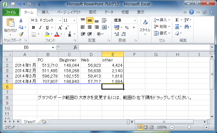 PowerPoint 2010でスライドにグラフを挿入すると、ダミーデータが入っています。このダミーデータを書き換えることで、スライドに挿入されたグラフに反映されます。