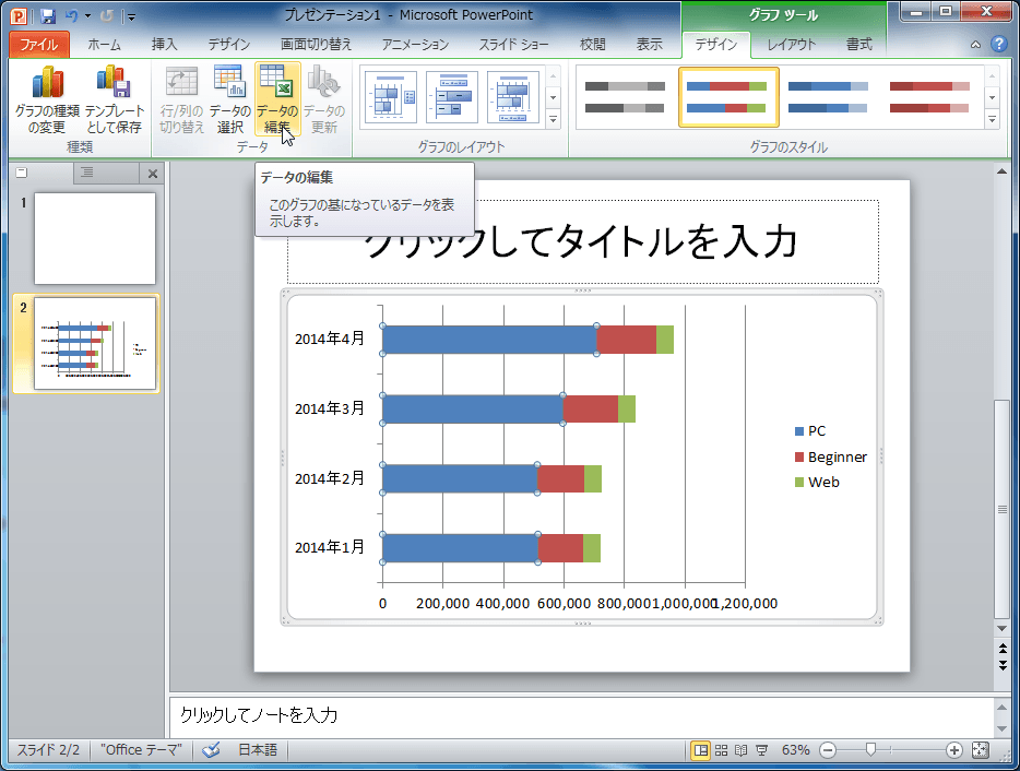 PowerPoint 2010でグラフの基となっているデータを表示して、グラフのデータを編集するには、グラフを選択し、[グラフツール]の[デザイン]タブを開いて、[データ]グループの[データの編集]をクリックします。