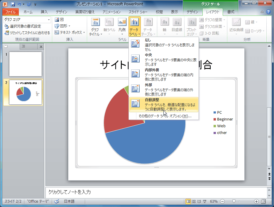 PowerPoint 2010で円グラフの場合、データラベルの配置方法は「中央」「中央外側」「外部」「自動調整」の4種類あります。値が少ない要素がある場合は「自動調整」にすると値が小さい要素には自動的に引き出し線を使って適切な配置にデータラベルが表示されます。