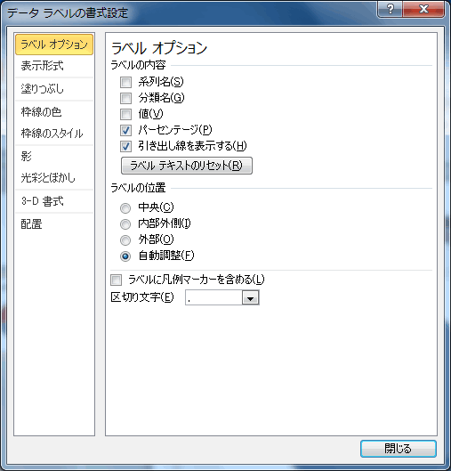 [ラベルオプション]の[ラベルの内容]から[パーセンテージ]と[引き出し線を表示する]にチェック