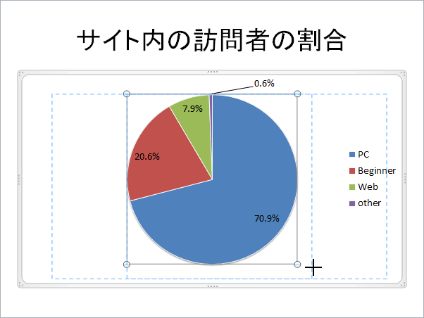 PowerPoint 2010でサイズを変更したい要素を選択し、四隅のハンドルをドラッグしてサイズを調整します。グラフ全体のサイズを変更するにはプロットエリアを選択するとOKです。