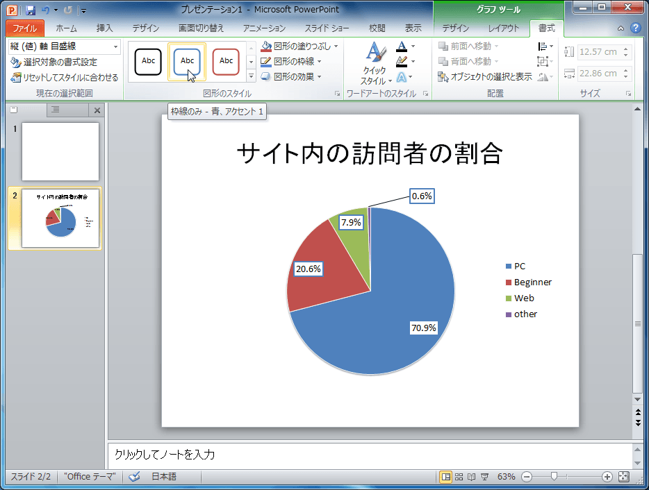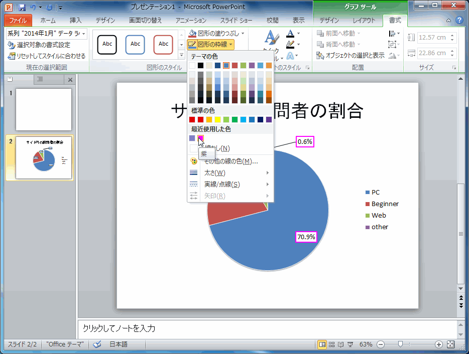 PowerPoint 2010でデータラベルに枠線を適用するには、データラベルを選択し、[グラフツール]の[書式]タブを開いて、[図形の枠線]から枠線の色やスタイルを選択します。なお、[図形のスタイル]のクイックスタイルから枠線スタイルを選択してもOKです。