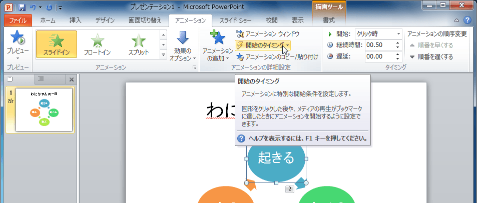 - [アニメーション]タブの[アニメーションの開始のタイミング]を選択します。