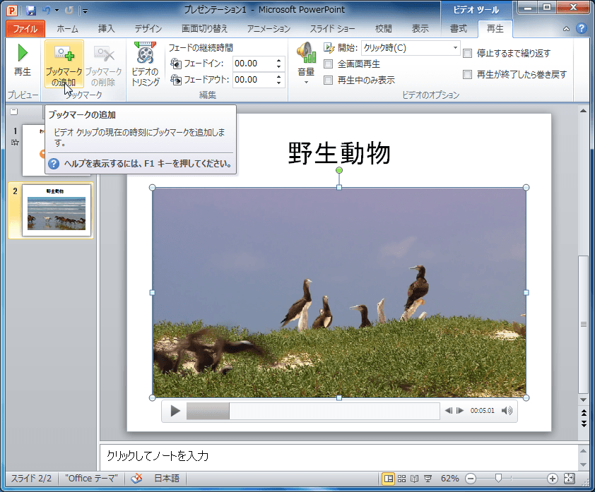 - あらかじめ、[ビデオツール]の[再生]タブを開き、ブックマークを付けたい時間を指定してブックマークを追加します。