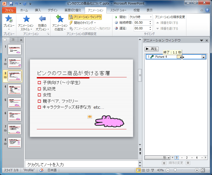 『アニメーションの速度を変更するには』 - アニメーションウィンドウの利用