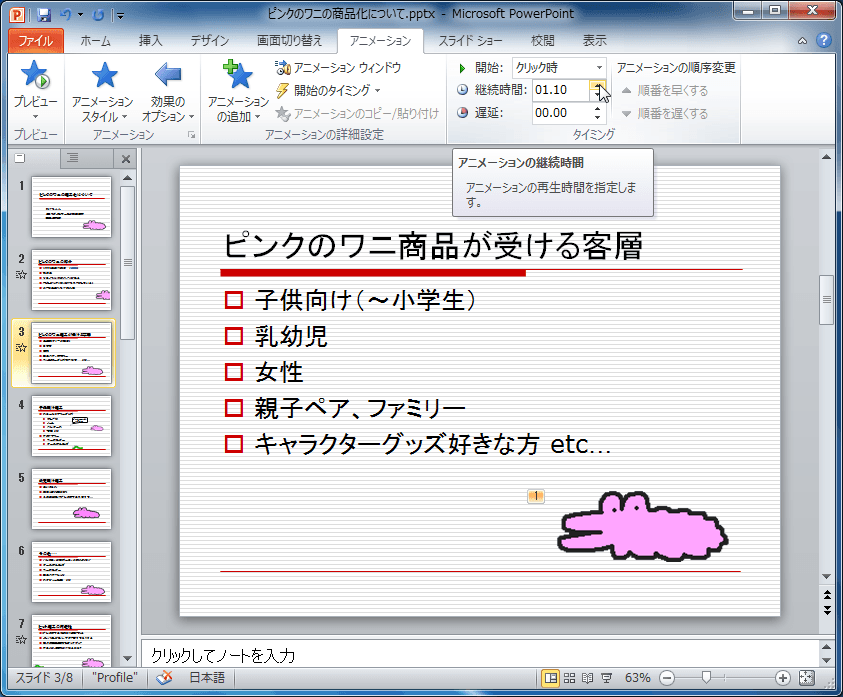- [アニメーション]タブの[タイミング]グループの[継続時間]