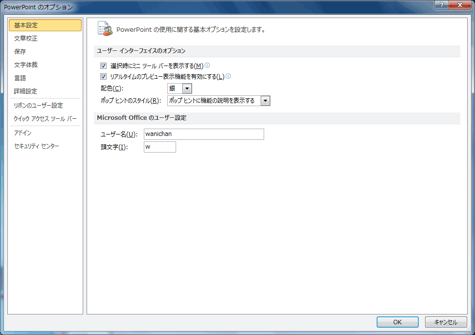 コメントには、ユーザー名とタイムスタンプが自動挿入されます。このユーザー名は[PowerPointのオプション]であらかじめ変更できます。[ファイル]タブを開き[オプション]をクリックして[PowerPointのオプション]ダイアログボックスを開き、[基本設定]タブの[ユーザー名]と[頭文字]を指定します。