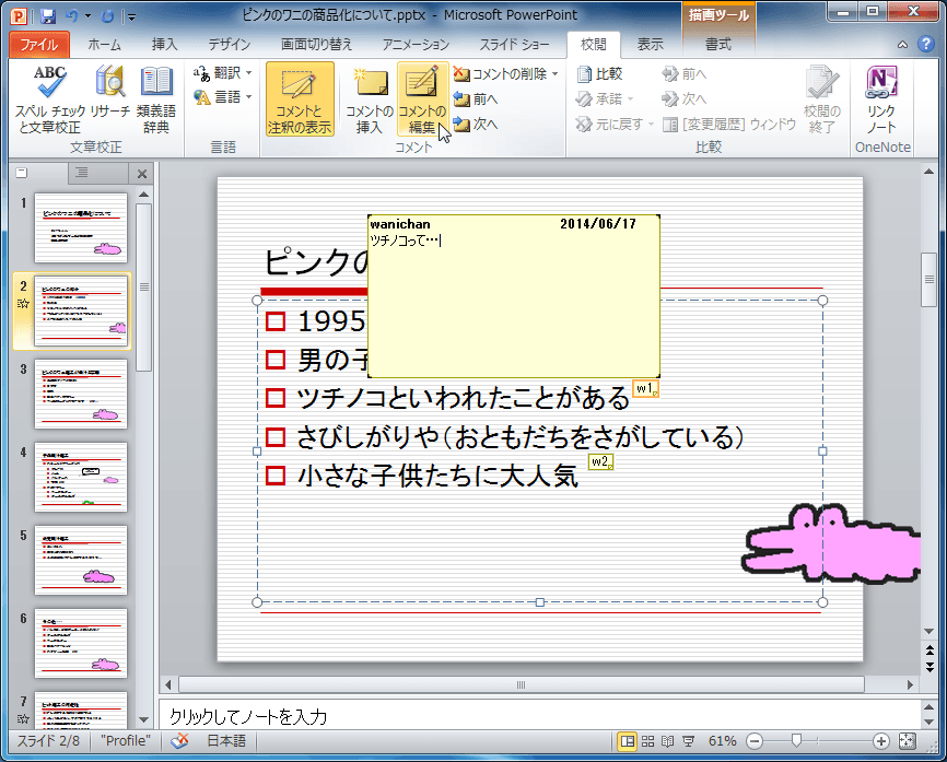 PowerPoint 2010でコメントが挿入された場所をポイントすると、コメントの内容を確認できます。編集したいコメントの前のカーソルを移動するか、コメントを選択して、[校閲]タブの[コメントの編集]をクリックします。