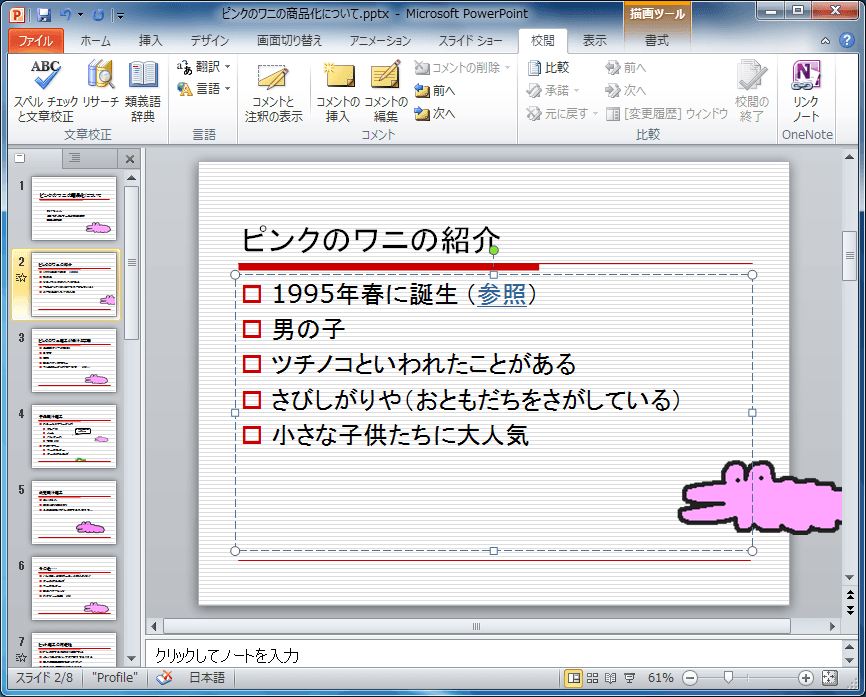 PowerPoint 2010既定では、コメントを挿入するとコメントの場所にタグ付けられて表示されます。コメントはスライドショー実行時には表示されませんが、編集画面においてコメントの表示・非表示を切り替える方法について説明します。