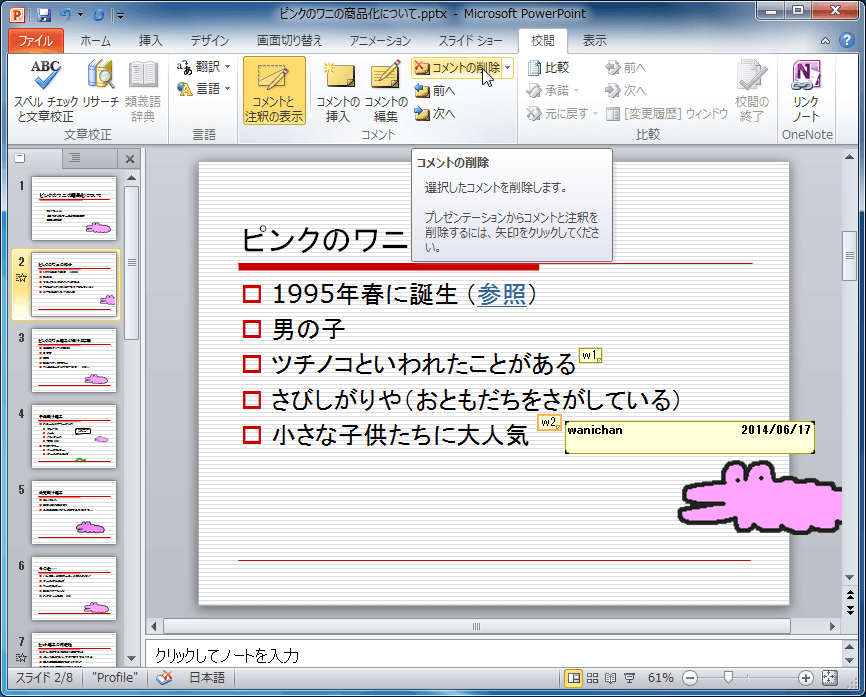 PowerPoint 2010で不要なコメントを削除するには、対象となるコメントを選択し、[校閲]タブを開き、[コメント]グループの[コメントの削除]をクリックします。Deleteキーを押してもOKです。