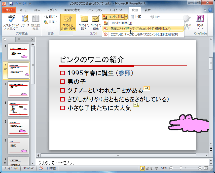 現在開いているスライドに複数のコメントが存在し、それらすべてのコメントと注釈を削除するには、PowerPoint 2010でいずれかのコメントを選択して[校閲]タブを開き、[コメント]グループの[コメントの削除]の▼をクリックして、[現在のスライドからすべてのコメントと注釈を削除]をクリックします。