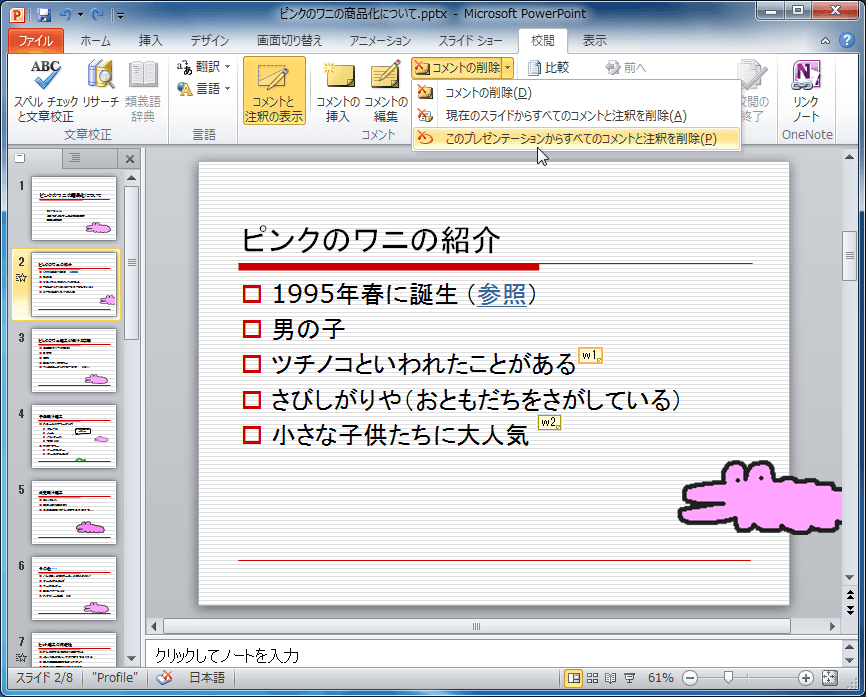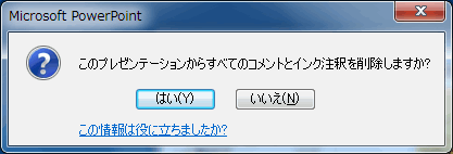 - 現在開いているプレゼンテーションからすべてのコメントと注釈が削除されました。