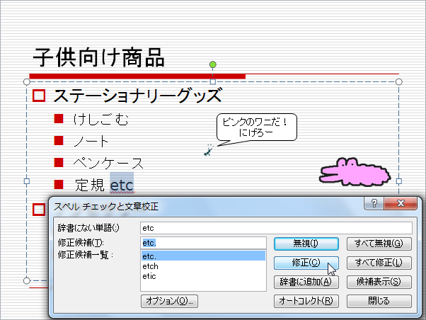 たとえば「わにちゃん」という固有名詞を今後スペルチェックの対象外にするには、[辞書に追加]ボタンをクリックします。