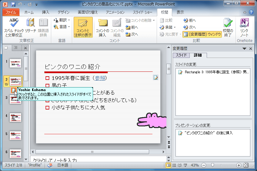 プレゼンテーションを複数人数で編集しているうちに、複数のプレゼンテーションファイルができてしまった場合、PowerPoint 2010で一つに結合することができます。[校閲]タブを開き、[比較]をクリックして対象となるプレゼンテーションファイルを開き、変更内容を確認していきます。