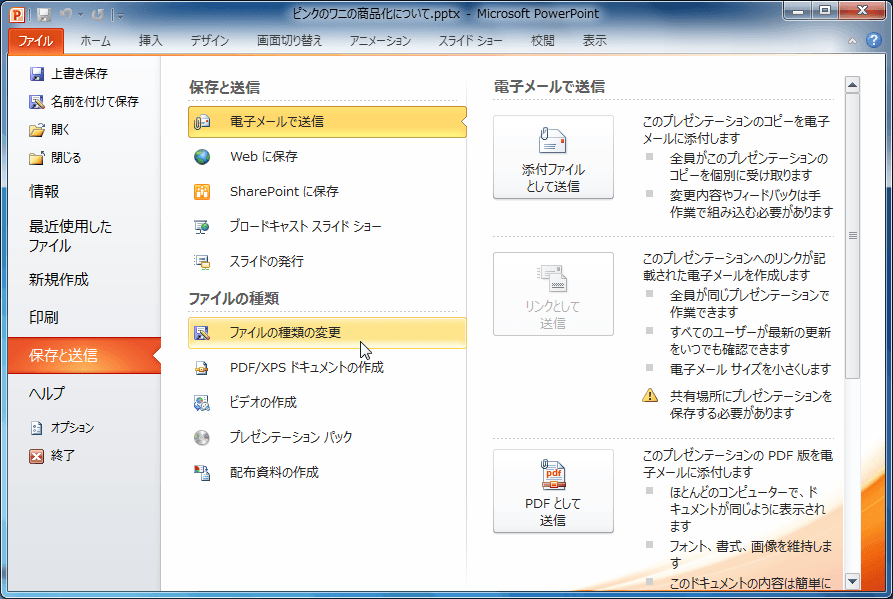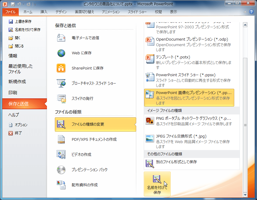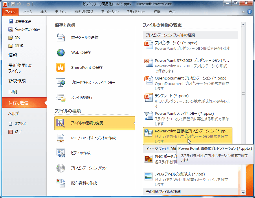 [ファイルの種類の変更]オプションの[プレゼンテーションのファイルの種類]一覧から[PowerPoint画像化プレゼンテーション]を選択します。