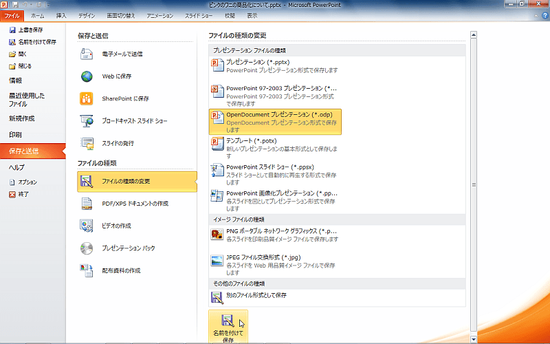 PowerPoint 2010で[ファイル]タブを開き、[保存と送信]を選択して、[ファイルの種類]一覧から[ファイルの種類の変更]を選択し、[プレゼンテーションファイルの種類]一覧から[OpenDocumentプレゼンテーション (*.odp)]を指定します。