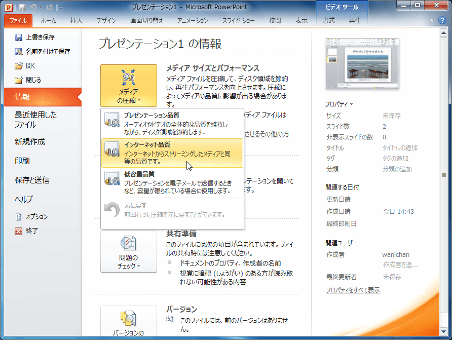 プレゼンテーション内のオーディオとビデオを、インターネット配信用に圧縮するには、メディアを圧縮するとよいでしょう。PowerPoint 2010で[ファイル]タブの[情報]を開き、[メディアの圧縮]を実行します。