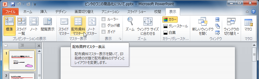 PowerPoint 2010で配布資料マスターを開いて、印刷時の状態で配布資料のデザインとレイアウトを変更するには、[表示]タブを開き、[配布資料マスター]をクリックして、デザインやレイアウトを変更します。