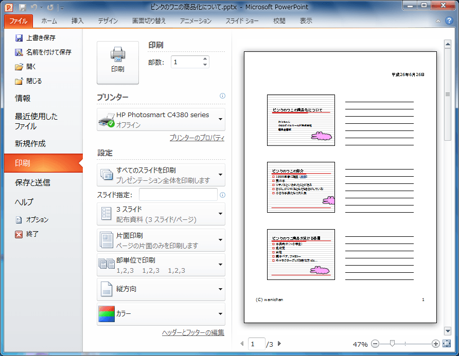 - 印刷対象などを指定します。ここでは、3スライドの配布資料を選択しています。