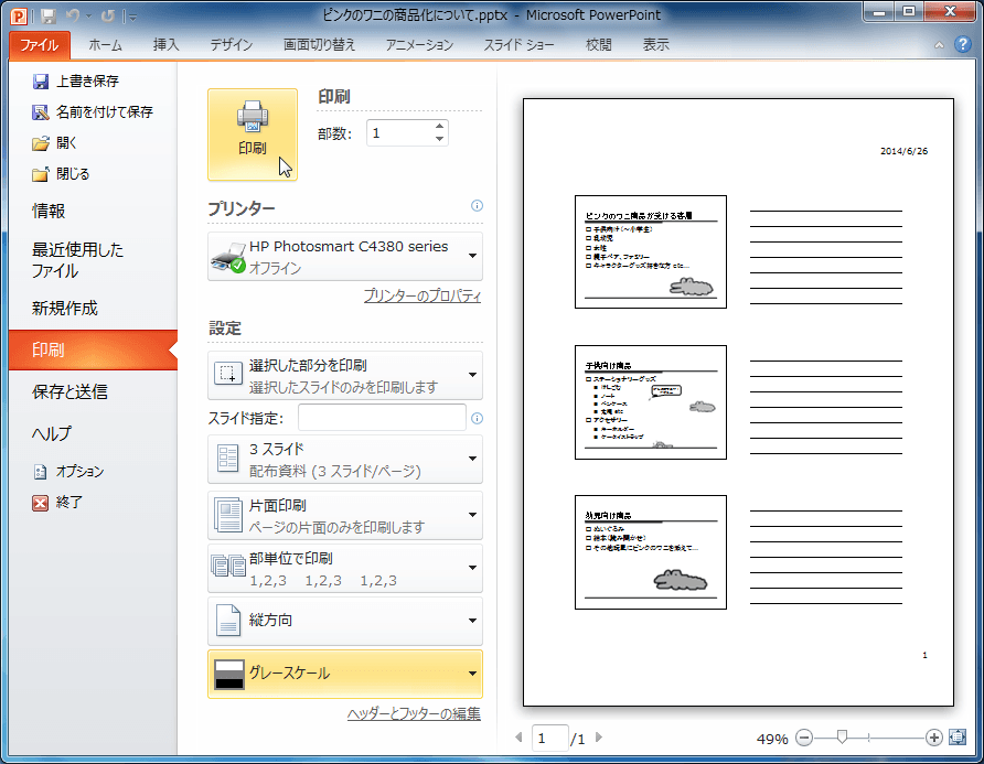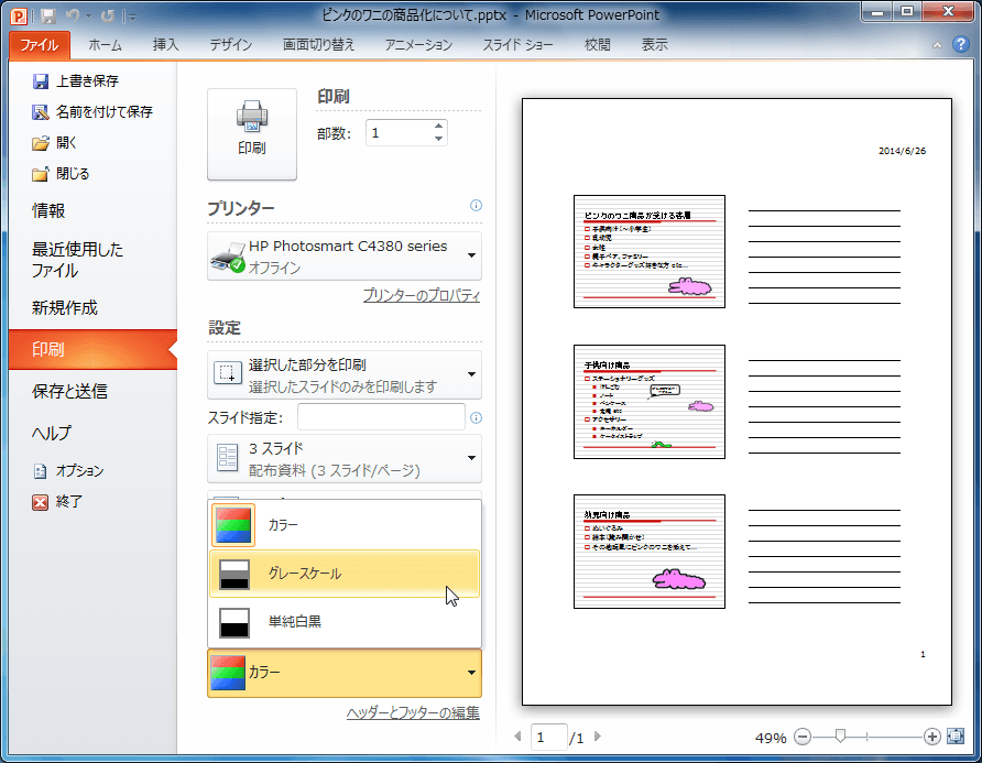 選択したスライドの配布資料をグレースケールで印刷