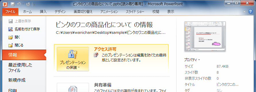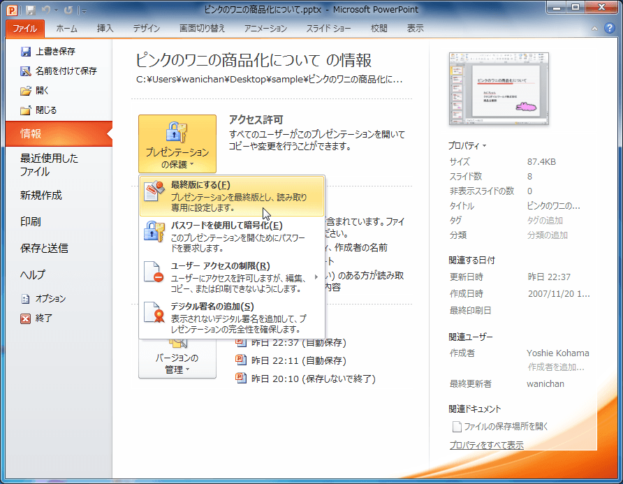 PowerPoint 2010でプレゼンテーションを最終版にし、読み取り専用に設定するには、[ファイル]タブを開き、[情報]タブの[プレゼンテーションの保護]をクリックして[最終版にする]を選択します。