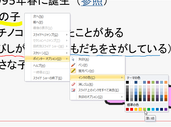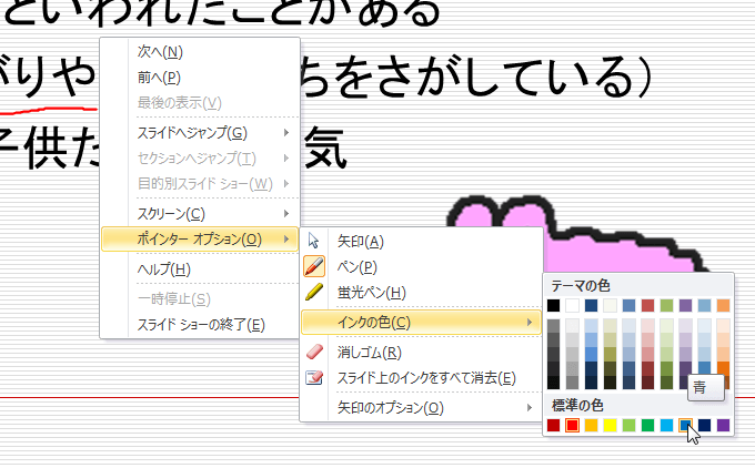 PowerPoint 2010既定のペンのインクの色は赤、蛍光ペンのインクの色は黄色ですが、必要に応じてインクの色を変更することも可能です。右クリックして、ショートカットメニューより[ポインターオプション]、[インクの色]をポイントし、変更したい色を選択します。