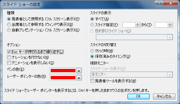 [スライドショーの設定]ダイアログボックスの[オプション]設定より[ペンの色]や[レーザーポインターの色]を変更します。