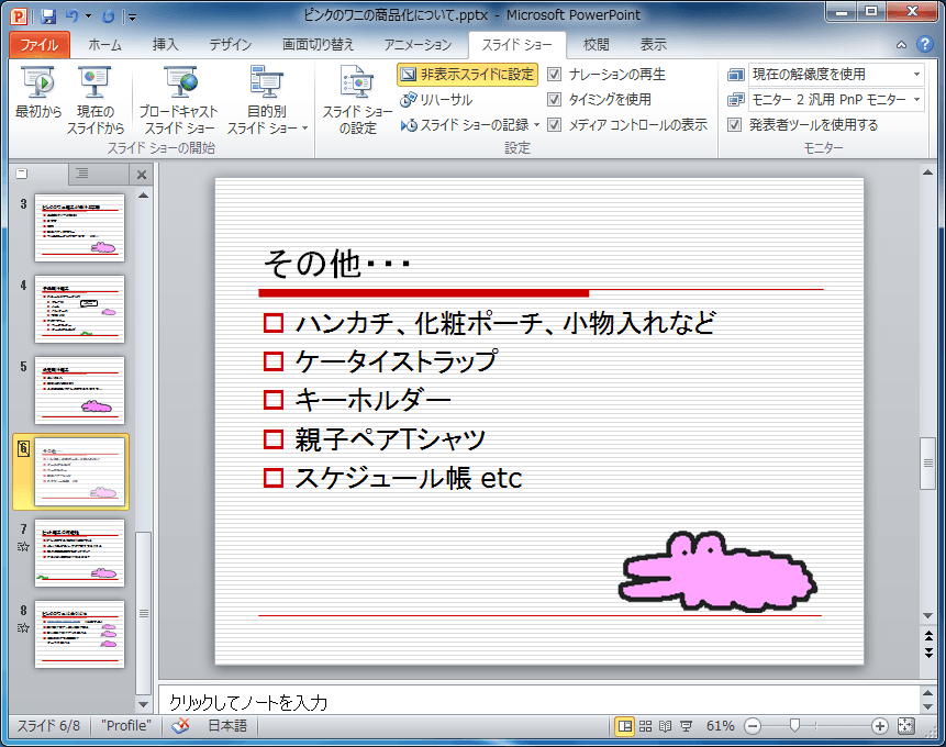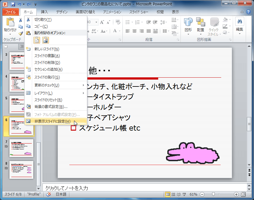 - 非表示スライドに設定されると、[非表示スライドに設定]が下の図のようにハイライトになります。