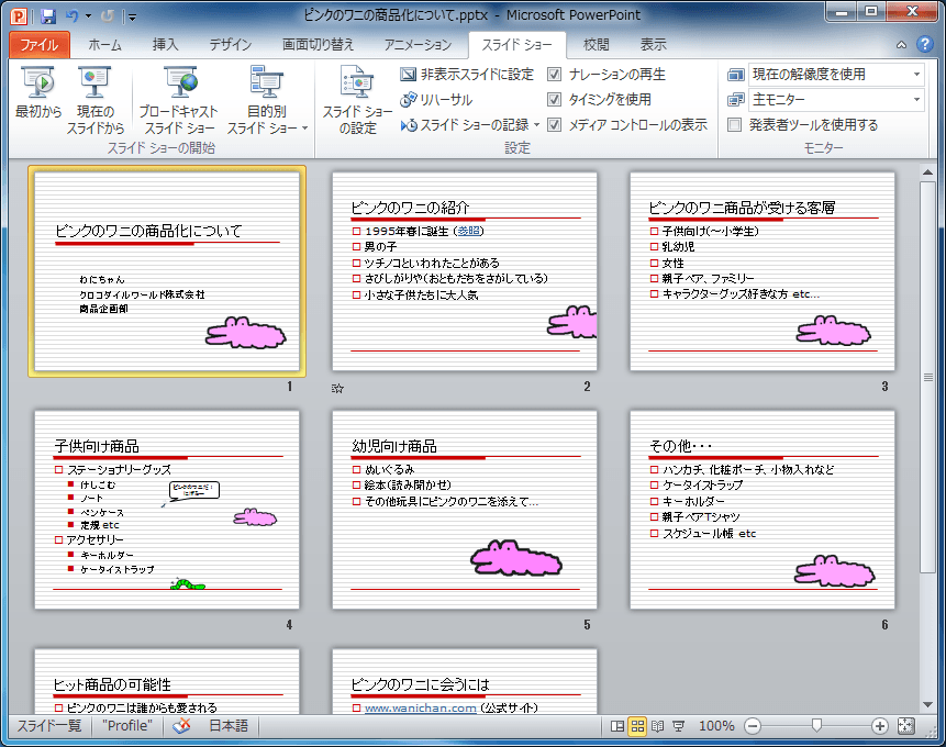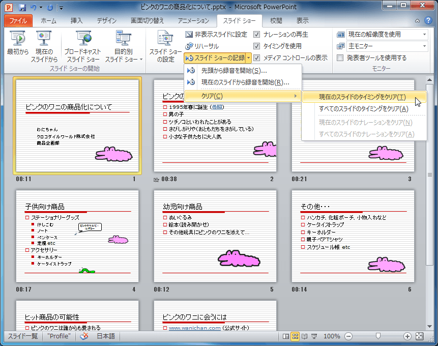 - [スライドショー]タブを開き、[スライドショーの記録]をクリックして、[クリア]をポイントし、[すべてのスライドのタイミングをクリア]を選択します。