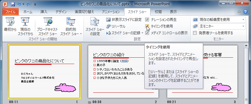 PowerPoint 2010でリハーサルで記録されたタイミングをクリアするには、[スライドショー]タブを開き、[スライドショーの記録]をクリックして、[クリア]をポイントし、[現在のスライドのタイミングをクリア]または[すべてのスライドのタイミングをクリア]を選択します。一方、タイミングは保持したいけれども、そのタイミングを使わないようにするには、[スライドショー]タブの[設定]グループの[タイミングを使用]のチェックを外すとOKです。