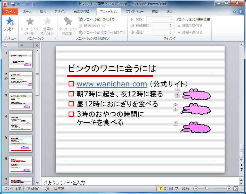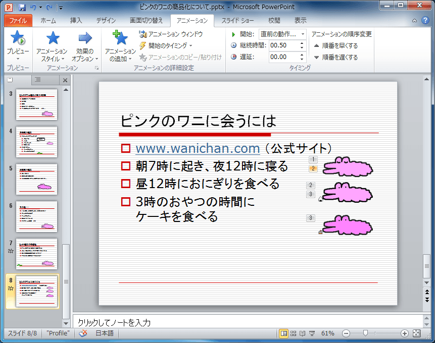 - タイミングを調整したいスライドを選択します。