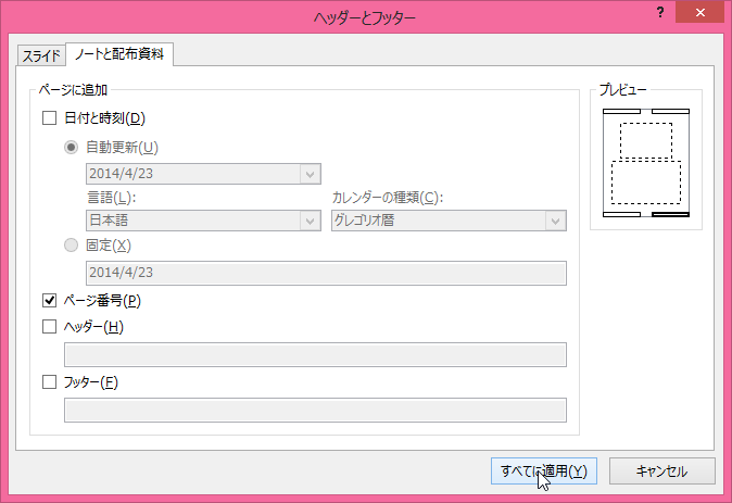 - [ヘッダーとフッター]ダイアログボックスの[ノートと配布資料]タブを開き、[ページ番号]にチェックを入れて、[すべてに適用]をクリックします。