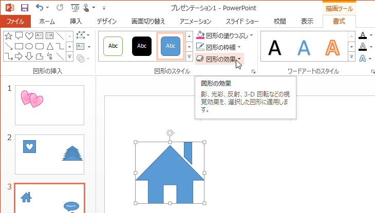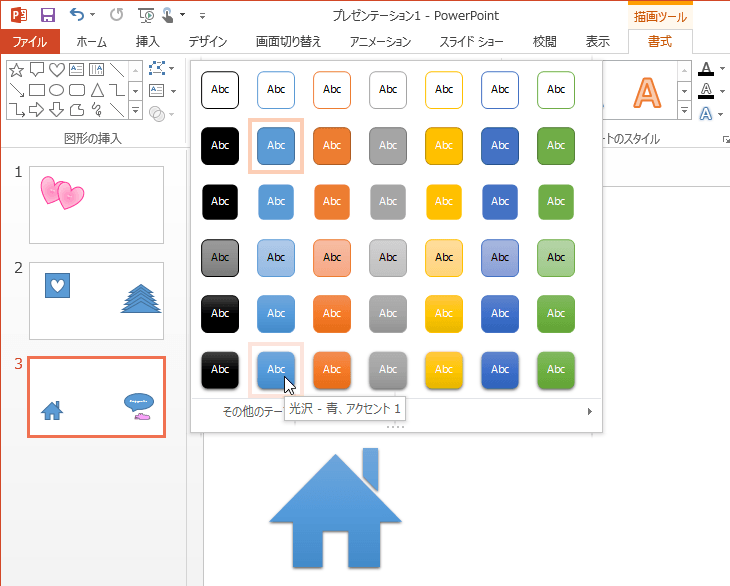 PowerPoint 2013の図形のスタイルには、現在のテーマの塗りつぶしスタイルのほか、影付き、縁取りや3.-D回転等、さまざまな効果が用意されています。対象となる図形を選択して、[描画ツール]の[書式]タブを開き、[図形のスタイル]グループから目的のスタイルを選択します。