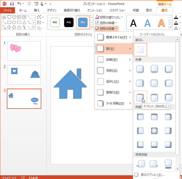 - 一覧から[影]をポイントして、適用したい影の種類を選択します。