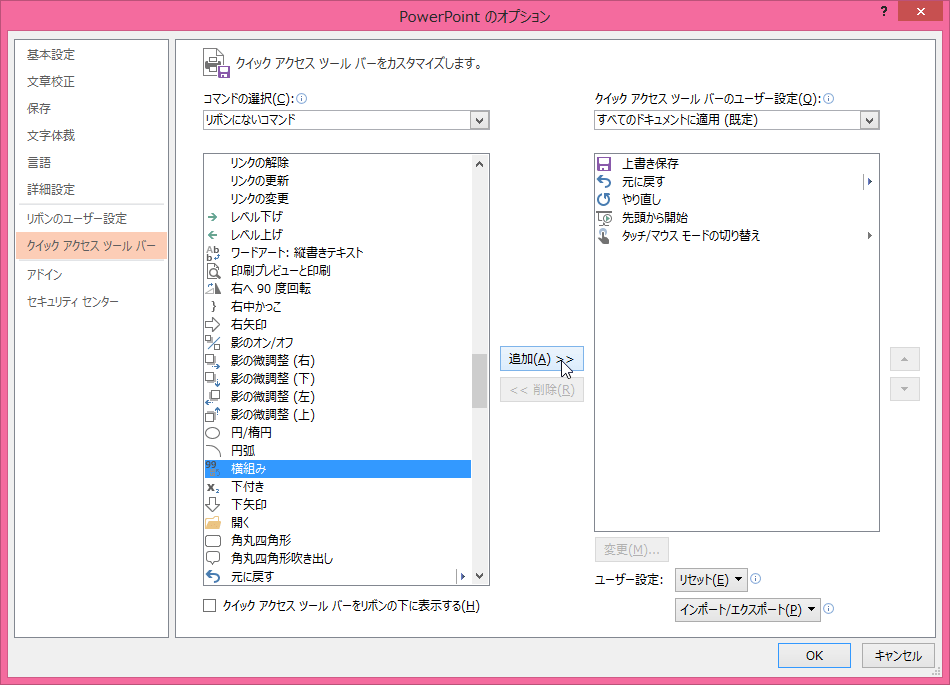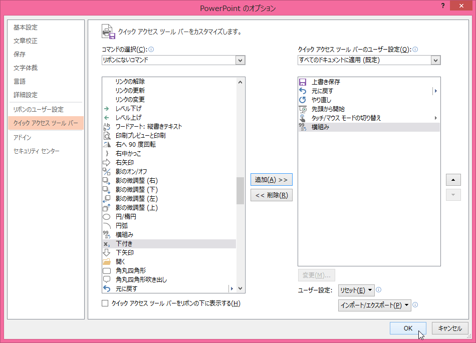 - クイックアクセスツールバーに追加されたら[OK]ボタンをクリックします。