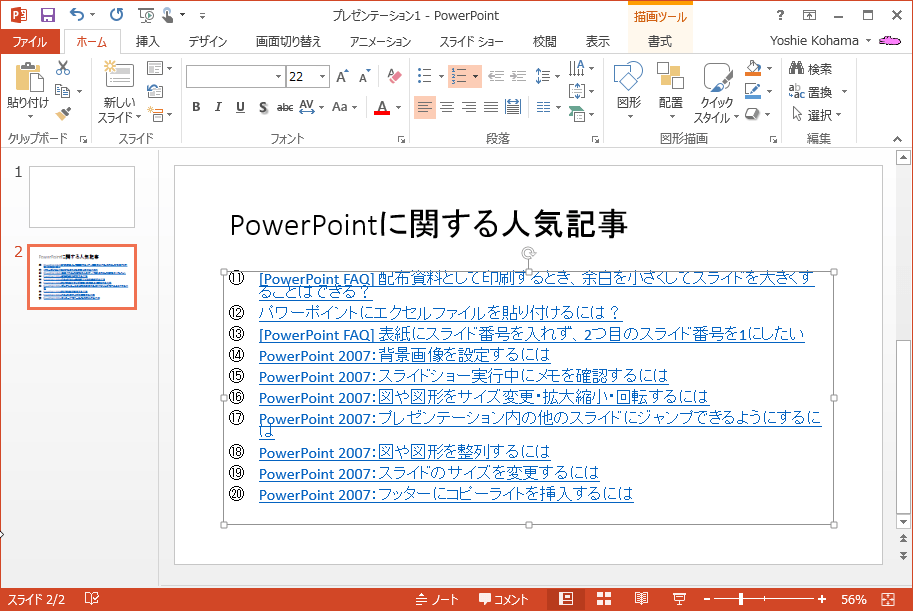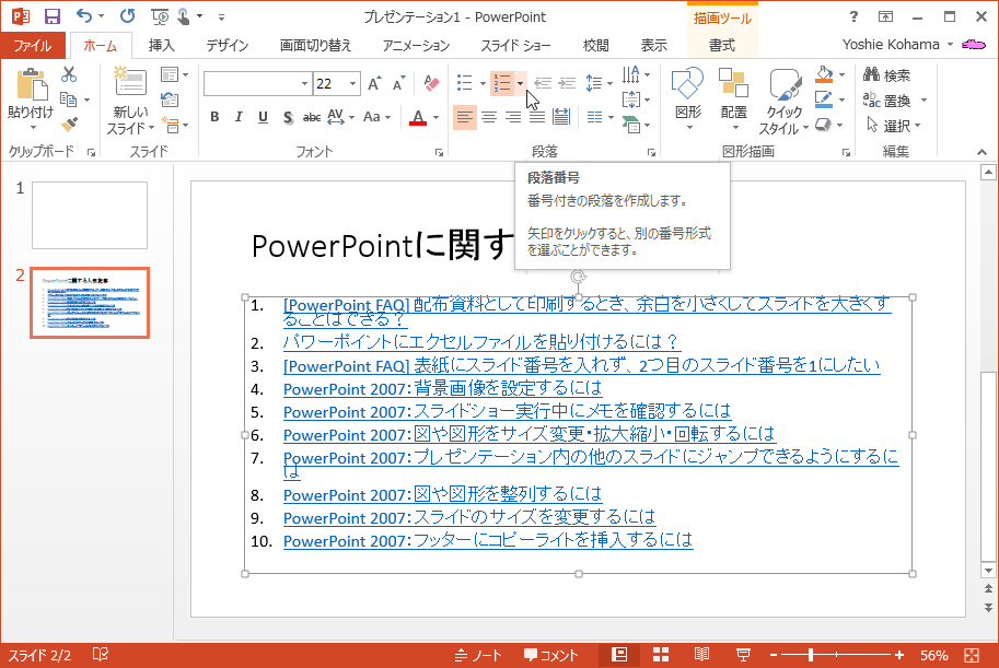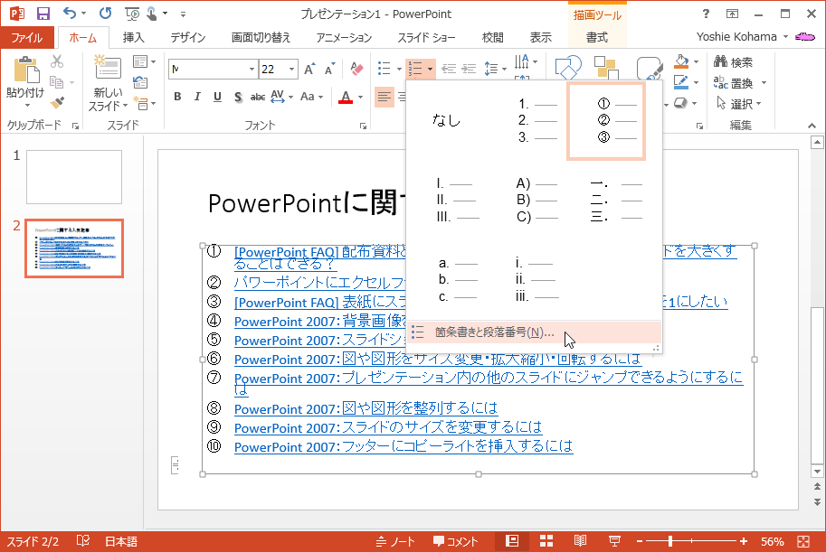 段落番号にも様々な書式があります。PowerPoint 2013で段落番号の書式を変更するには、[ホーム]タブの[段落]グループの[段落番号]の▼をクリックして、変更したい書式を選択します。また、途中から番号を振ることも可能です。