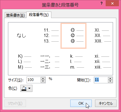 - [箇条書きと段落番号]ダイアログボックスの[段落番号]タブの右下の[開始]ボックスに開始番号を指定して[OK]ボタンをクリックします。